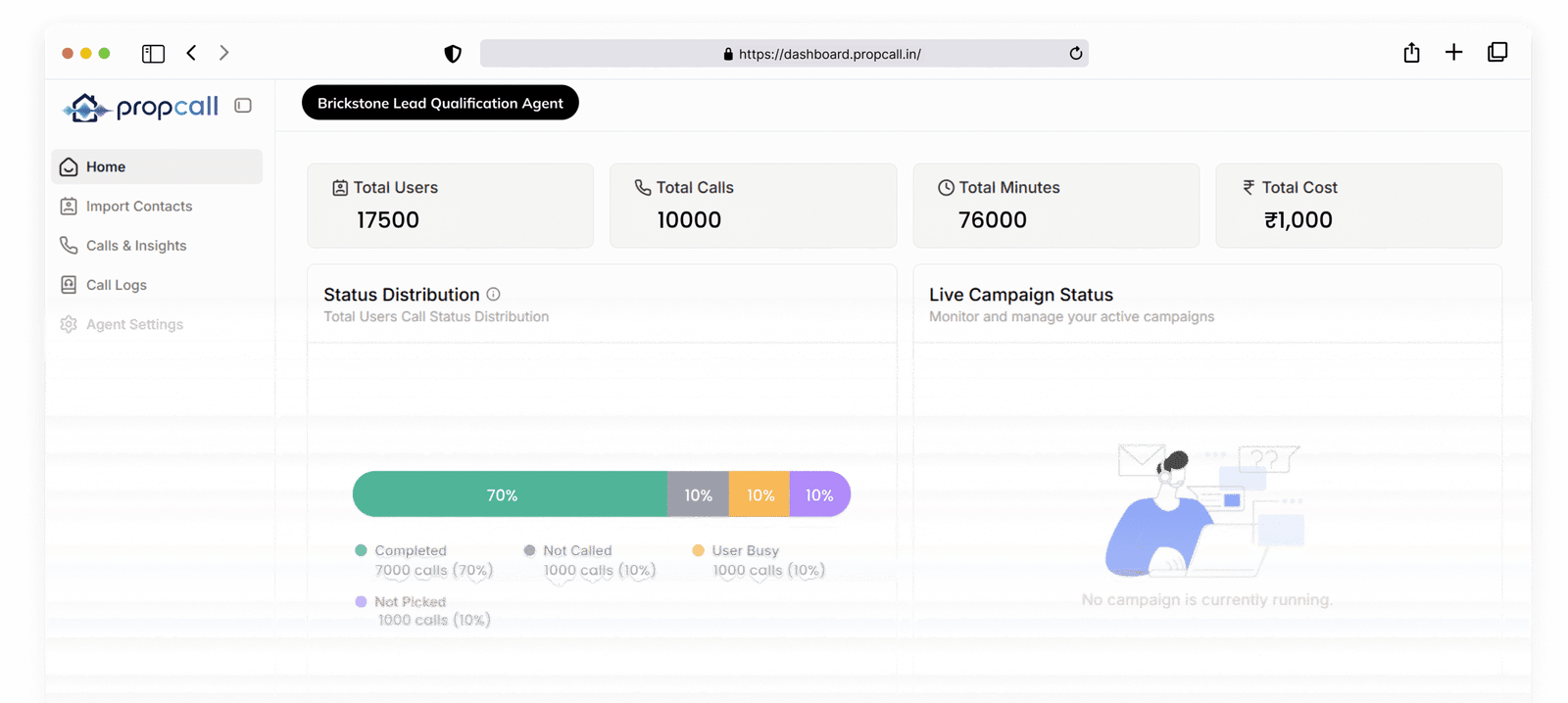 Run your voice campaigns without constant supervision. PropCall’s self-learning AI agents can manage thousands of calls simultaneously — scheduling visits, qualifying leads, or updating records automatically.
